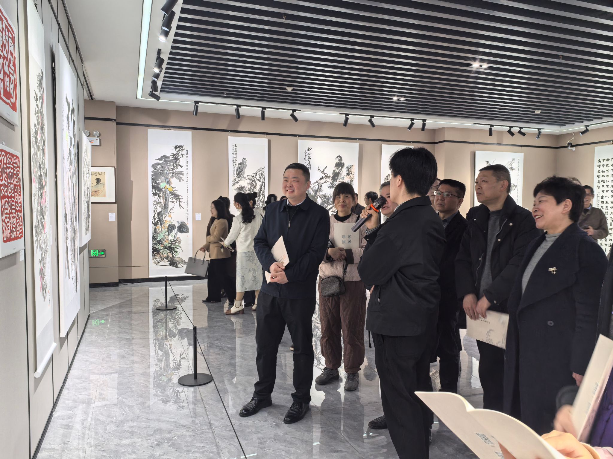 四位青年校友艺术家均曾求学于春晖湖畔,受教于李波老师,始终坚守传统艺术正脉,形成鲜明风格,在各自领域成绩显著。参展校友代表崔明东、刘文进先后发言,深情回望在母校的求学岁月。各位领导嘉宾先后发表讲话,对展览给予高度评价。湖北工程学院党委常委、副校长郑俊郑重宣布展览开幕。本次展览不仅是湖北工程学院艺术教育成果的集中呈现,更是学校推动美育工作、传承优秀传统文化、服务地方文化建设的务实举措,为传统书画印艺术的当代传承与发展注入了青年活力,也让更多人感受到中华优秀传统文化在新时代的生生不息。