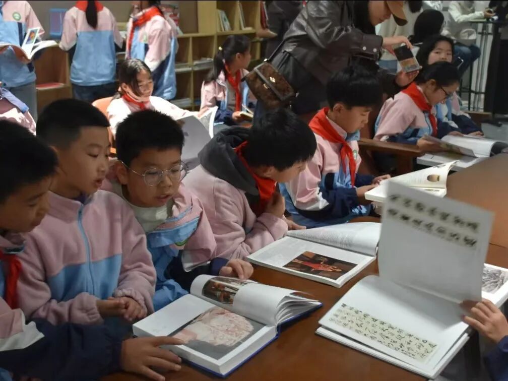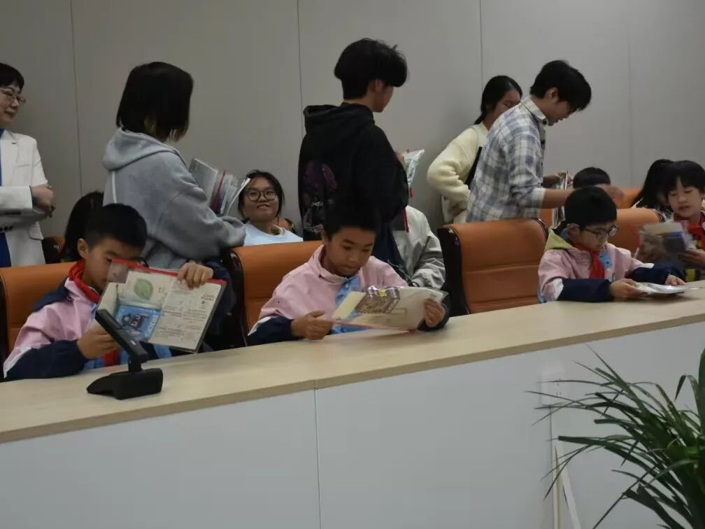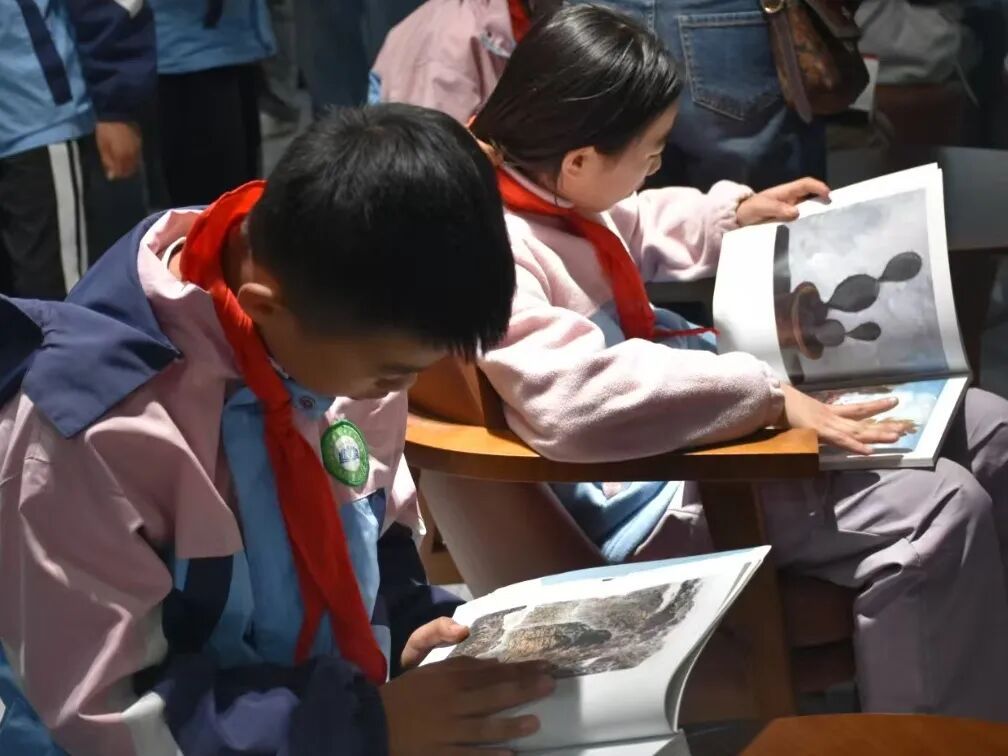 离开展厅,孩子们来到二楼阅览室,开启一段安静惬意的品读时光。这里陈列着美术启蒙绘本、中国画技法图书、艺术大师传记等丰富读物,为孩子们搭建了补充知识、拓宽视野的专属空间。孩子们在书架前自主挑选心仪书籍,或坐或站沉浸阅读,时而轻声交流书中趣事,时而专注记录喜欢的内容。马克思主义学院的志愿者在一旁适时引导,根据年龄与兴趣推荐读物,耐心解答关于艺术知识、民族文化的疑问。在墨香与书香的交融中,孩子们深化了对艺术的热爱,也增进了对民族文化的认同。