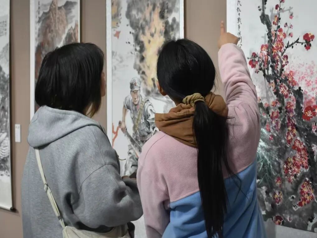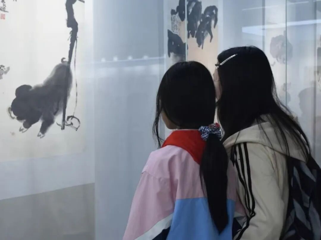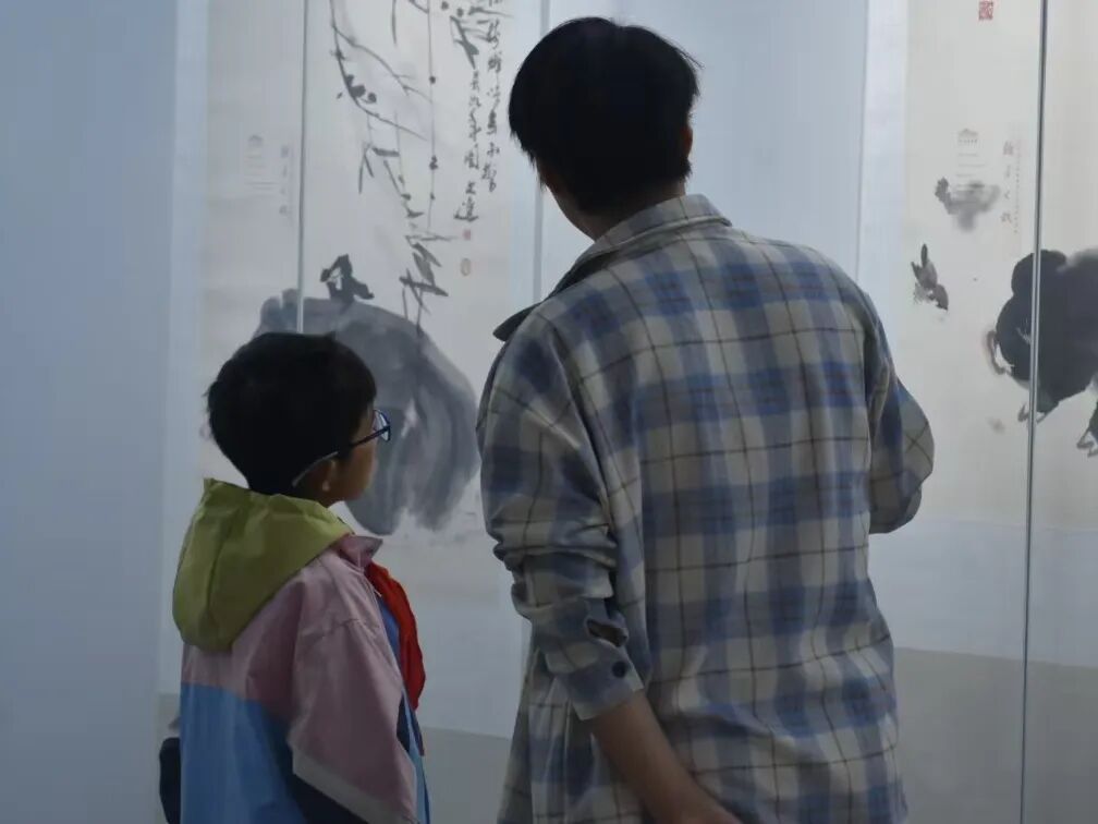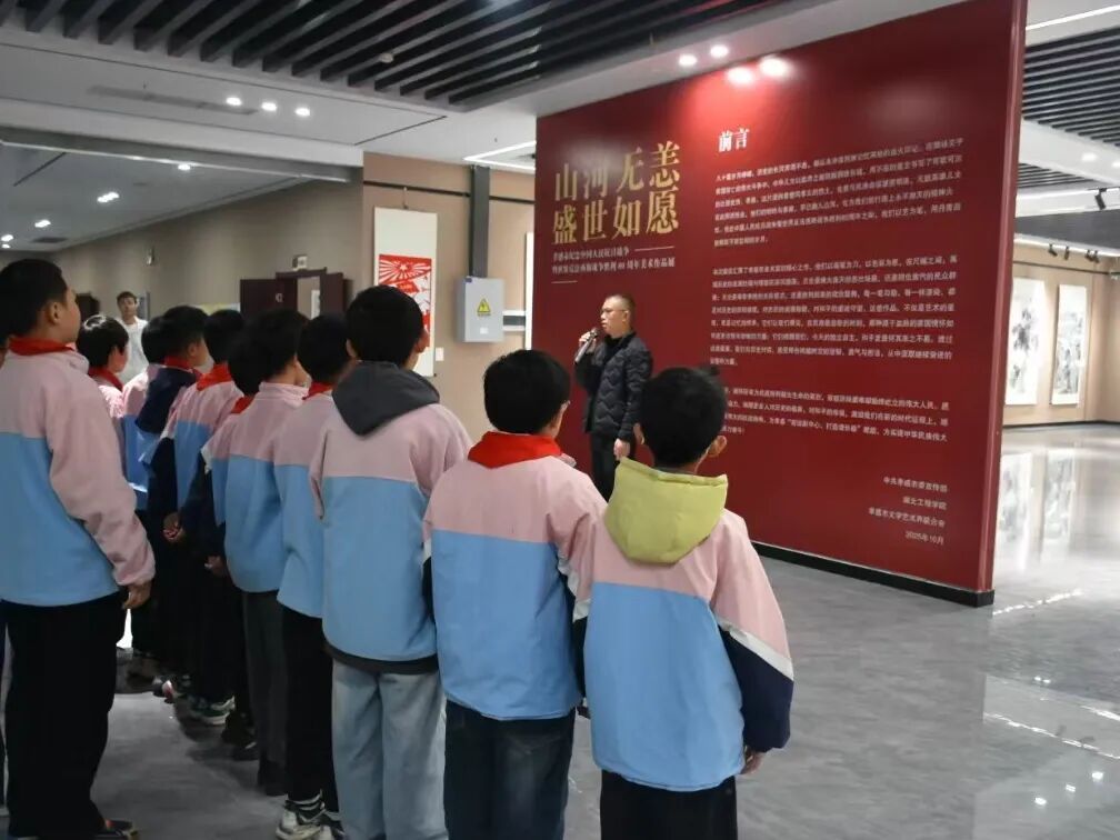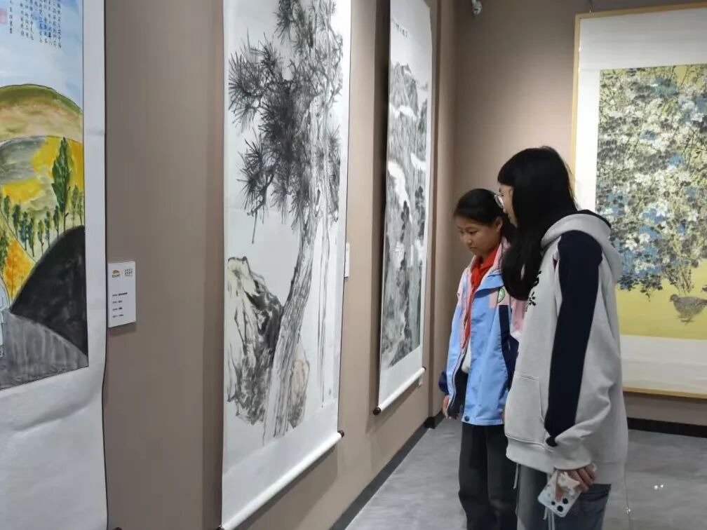 在艺术的殿堂里,除了专业的讲解,还有温暖的互动时刻。大学生志愿者与孩子们并肩驻足于一幅幅水墨佳作前,时而轻声交流画中的笔墨韵味,时而共同探寻作品里的文化深意。孩子们的好奇提问与志愿者的耐心解答交织,让艺术的种子在问答间悄然生长,也让这场研学之旅充满了思维碰撞的火花。