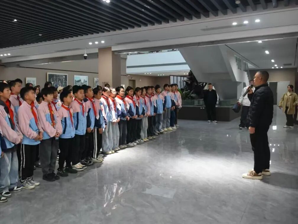 上午时分,孩子们在工作人员与马克思主义学院志愿者的引导下,排着整齐的队伍有序步入汤文选美术馆。一踏入场馆,庄重典雅的艺术氛围便扑面而来,孩子们瞬间被眼前的场景吸引,眼神中满是好奇与期待。美术馆李波副馆长走到队伍前方,为孩子们带来开场讲解,用简洁生动的语言介绍了本次活动“赏艺术、学团结、悟精神”的核心流程与目标。