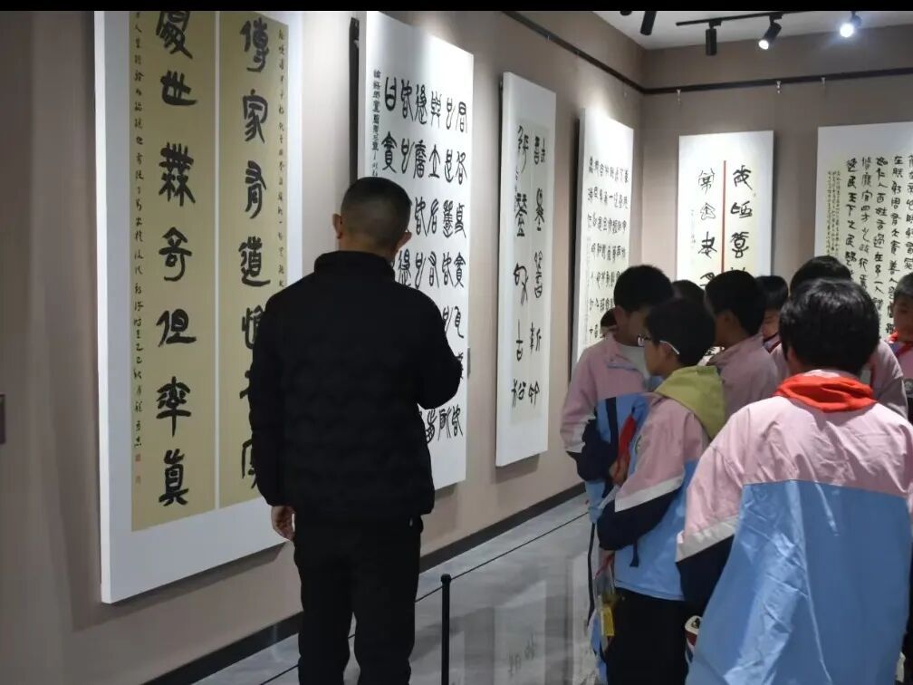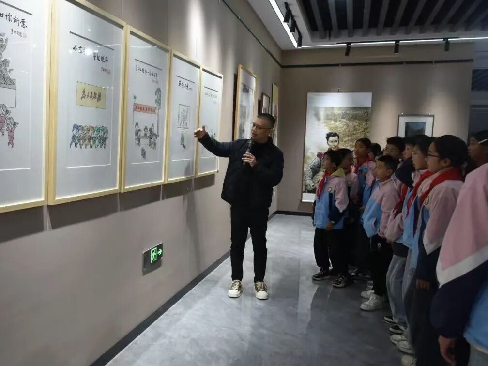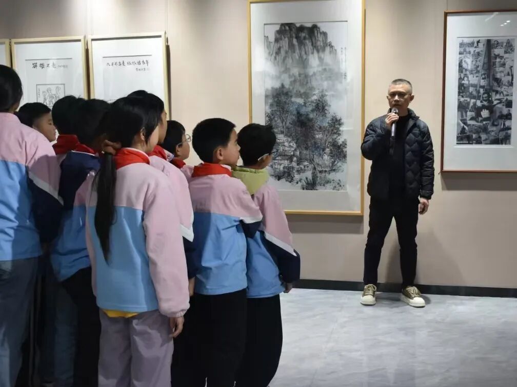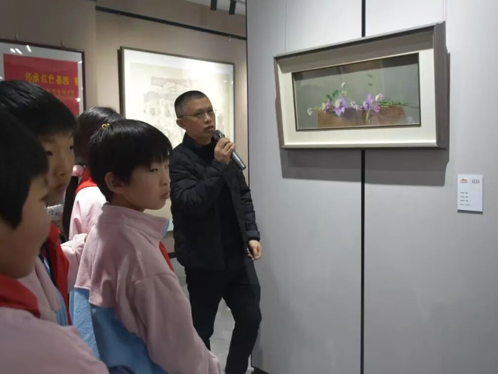 李馆长围绕每幅作品的创作背景、笔墨技巧与文化寓意展开深度解读,从花卉画作的清雅意趣,到书法作品的笔韵风骨,再到其他艺术创作的巧思匠心,一一为孩子们剖析。孩子们听得津津有味,不时举手提问,在问答互动中深化对作品的理解,读懂艺术与生活、时代与民族的紧密联结。