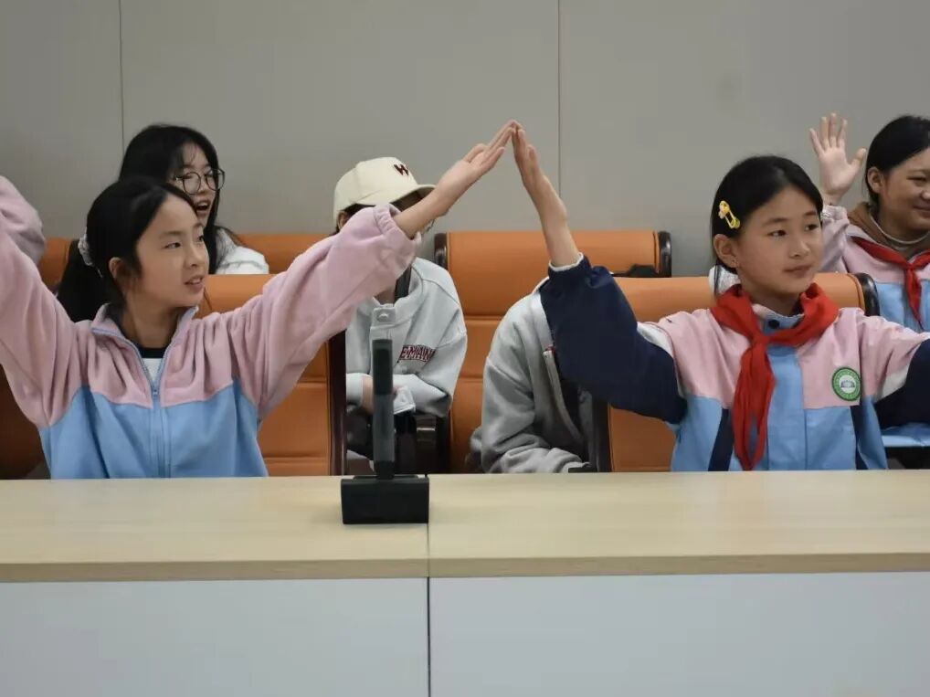 “刚刚老师带我们领略了艺术之美,也在书中了解了民族文化,接下来聊聊‘中华民族共同体意识’”,大学生志愿者以亲切开场抛出问题“你的家有多大?”,引导孩子们从父母小家、班级集体,延伸到校园、城市与中国。随后的互动中,“拥抱自己代表小家、与同学击掌象征集体、举双手连成天空喻指中华民族”,简单动作让孩子们直观感受“家”的延伸与共同体的内涵。